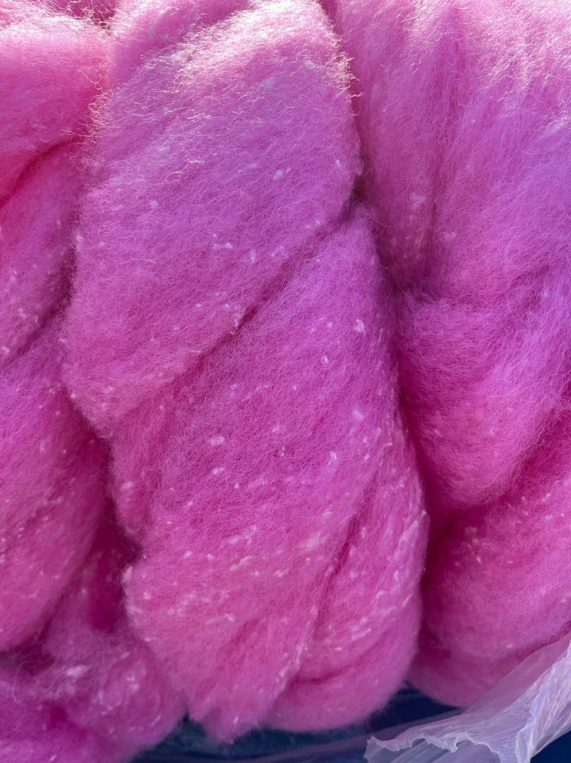 Deze gekaarde Corriedale in lont in de kleur roze is gemaakt met 95% corriedale en 5% moerbeizijde. De wol is zorgvuldig gekaard voor een gelijkmatige vezelstructuur, je zit op foto 2 hoe de moerbeizijde er doorheen is gemixed, deze mix is zeer geschikt voor spinnen, (naald)vilten, natvilten en weven.