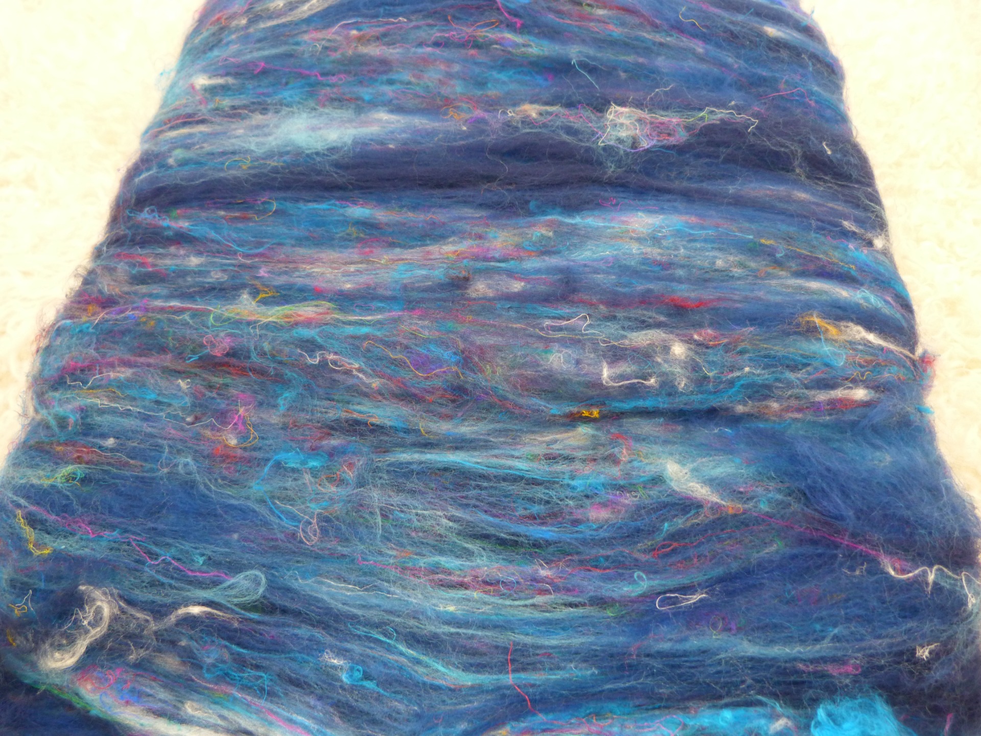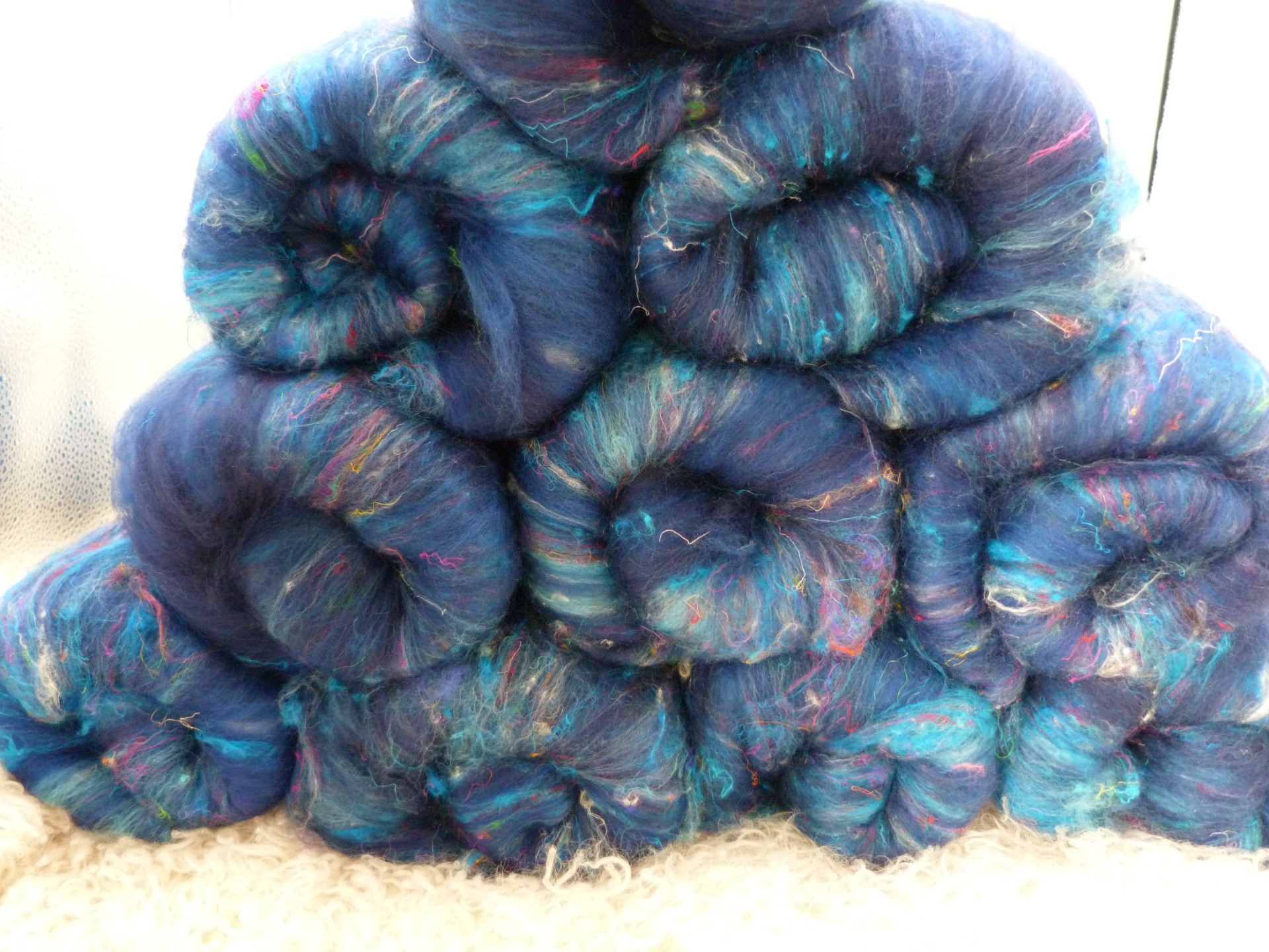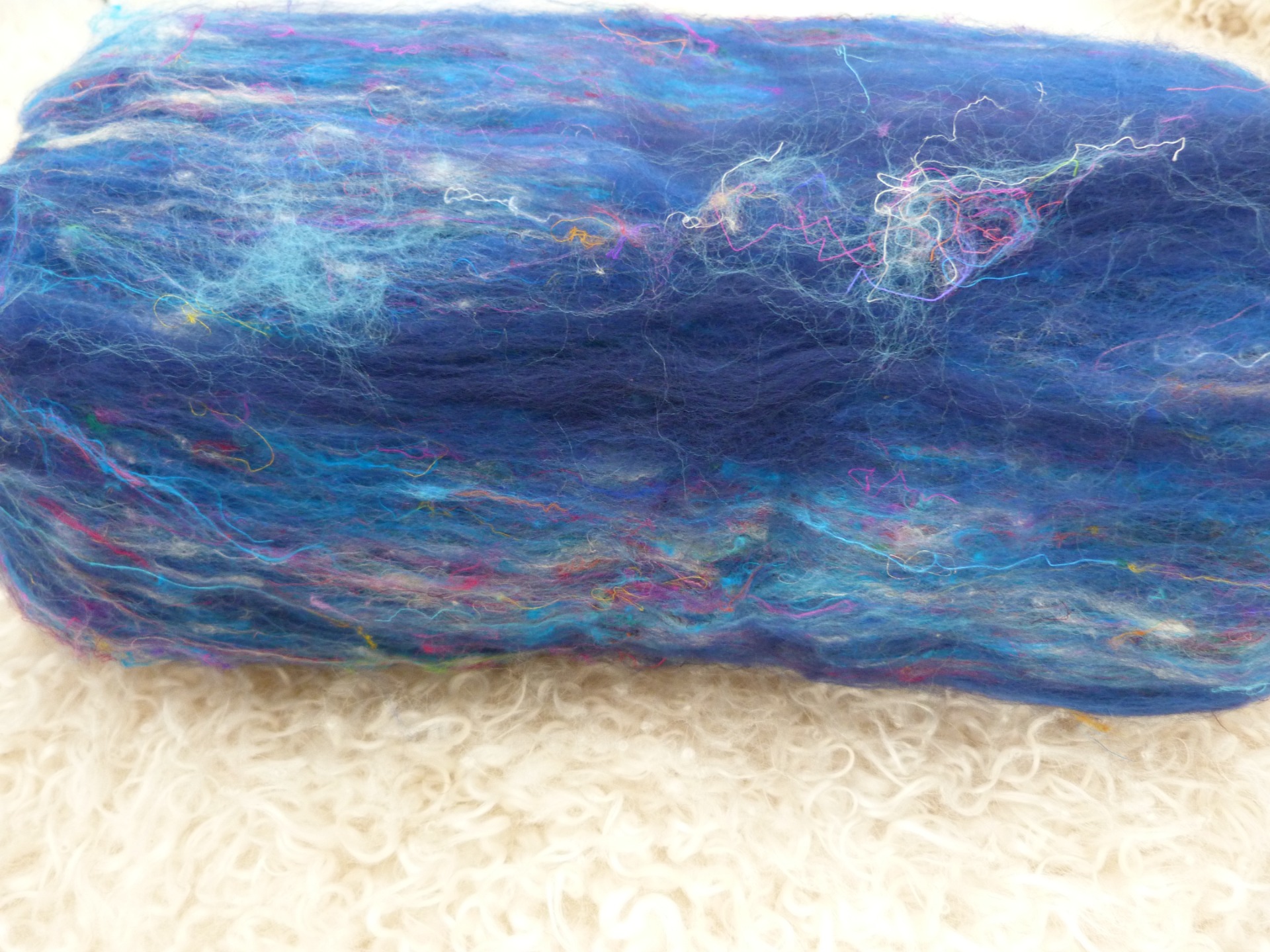 Deze blauw kleurige Batts worden met de handgekaard en wegen 100 gram per stuk, de batts worden gemaakt met 75% merino wol van 19 micron en 25% sari zijde, iedere batt bevat evenveel gram van elke kleur, doordat de batts handmatig door ons zijn gedraaid en 2 keer door de kaardmachine zijn geweest om de wol en sari goed te vermengen kunnen ze verschillend ogen. Deze batts zijn zeer geschikt om mee te spinnen, vilten en weven. Laat je verrassen door de mooie kleuren die uit je batt komen!