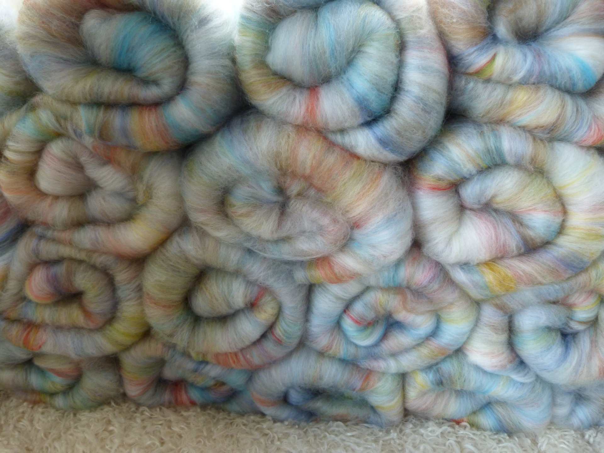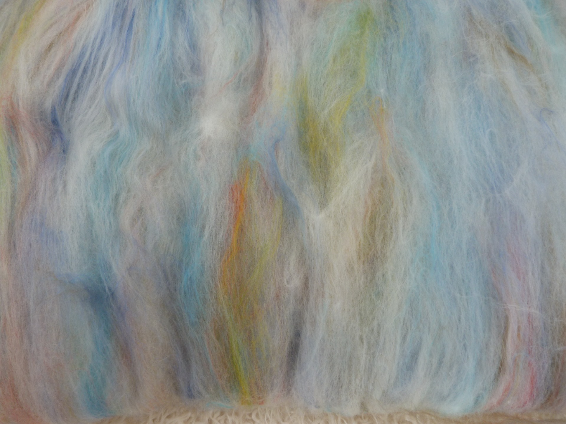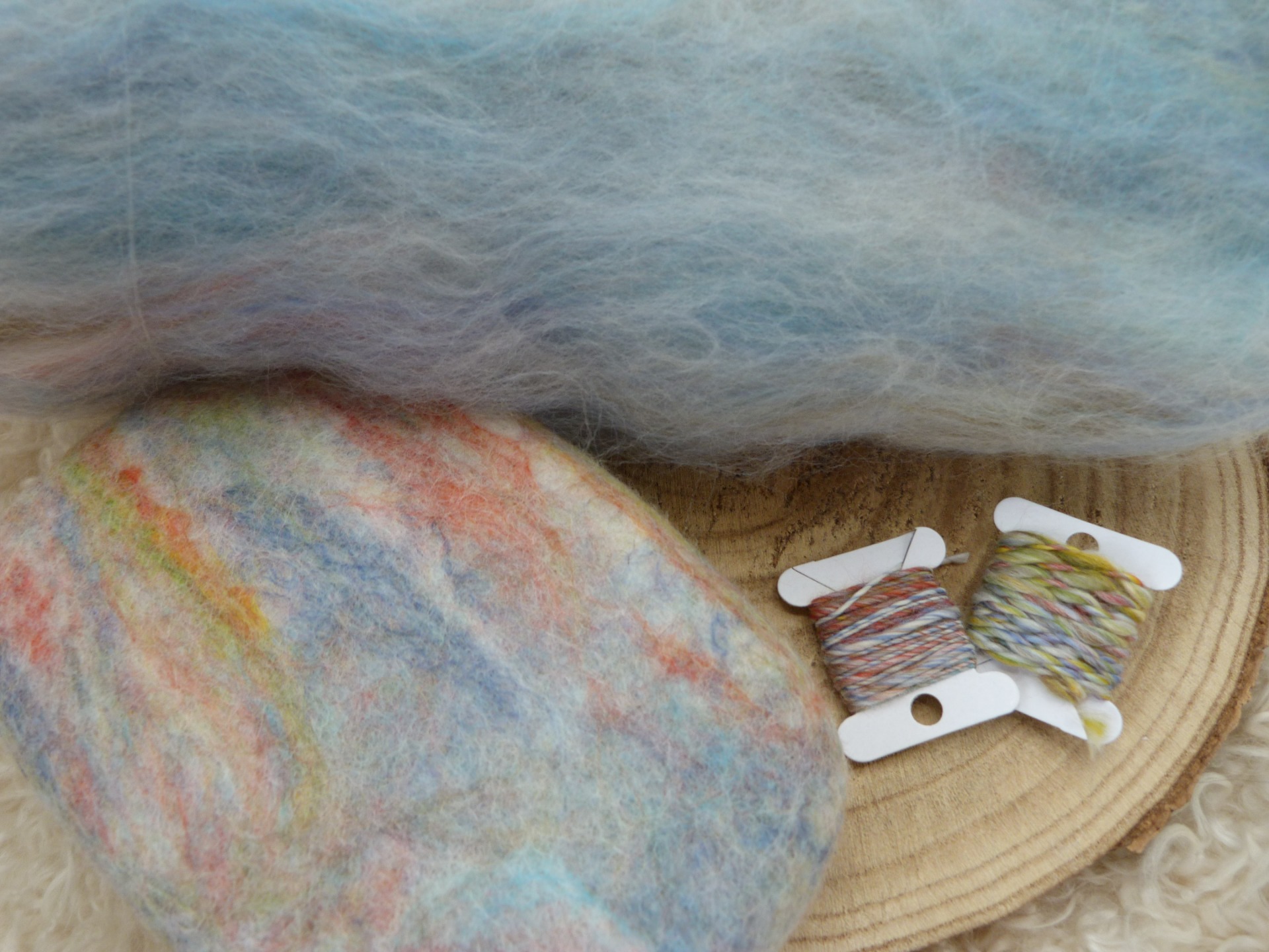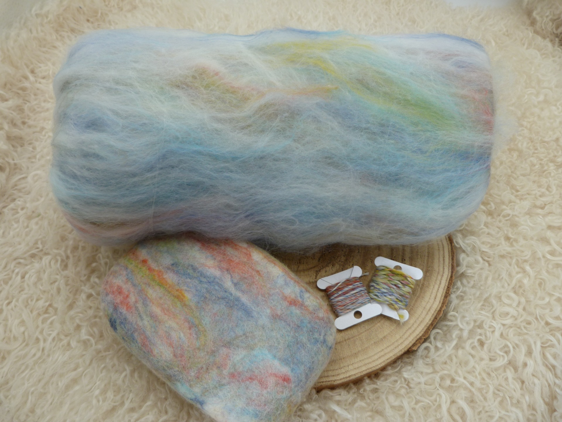 Deze melange batt is special voor Schapenvacht en Lifestyle geblend in 7 verschillende kleuren, deze blend bestaat uit 90% merino lontwol 19 micron en 10% gekleurde viscose blauw. Deze Batts worden met de handgekaard en wegen 100 gram per stuk.