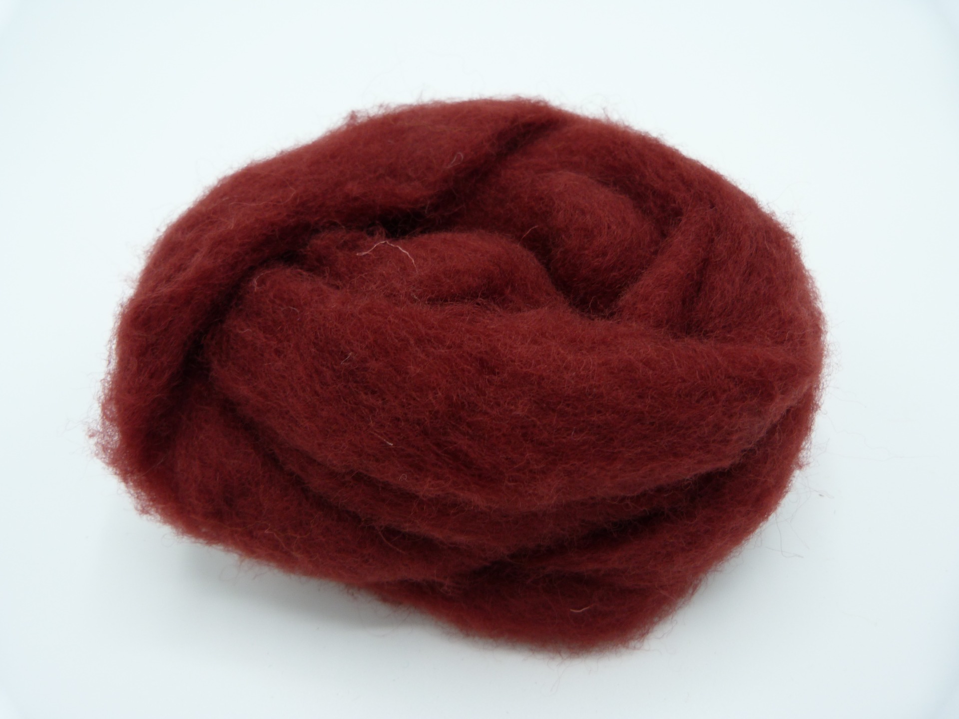 Gekleurde kaardvlies Corriedale in lont bordeaux.