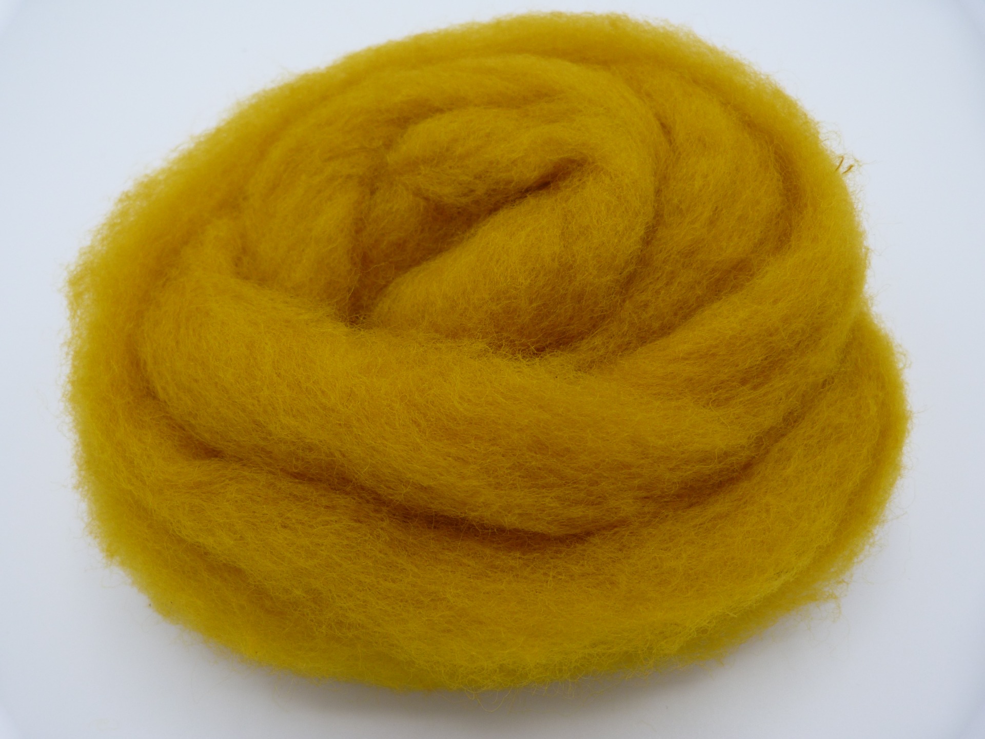 Gekleurde kaardvlies Corriedale in lont oker-geel.