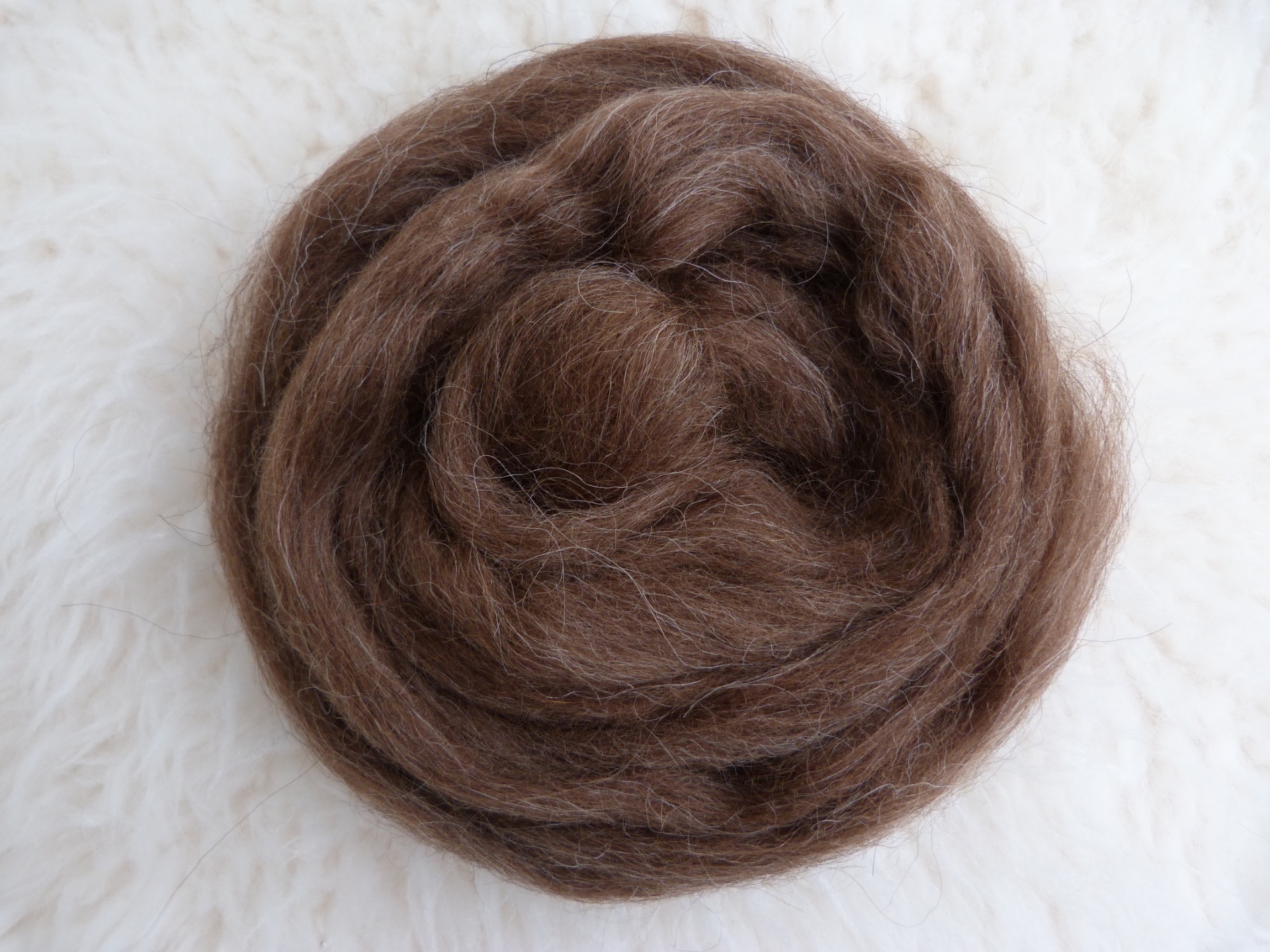 Een mooie glanzende wol met een micron van ± 34. Deze wol spint zalig. Deze wol is ook verkrijgbaar in de kleuren wit en zwart.