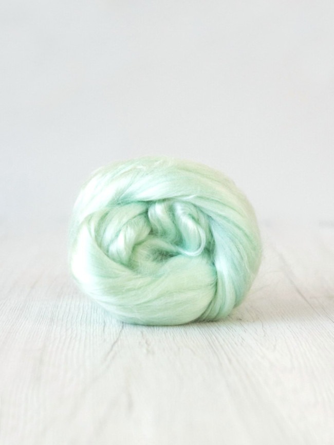 Deze viscose lont in een frisse mintkleur, ook wel kunstzijde genoemd, is heerlijk zacht, soepel en licht glanzend. De zachte, koele tint geeft een frisse en rustige uitstraling en is perfect als accentmateriaal of om te mengen met wol en andere vezels.