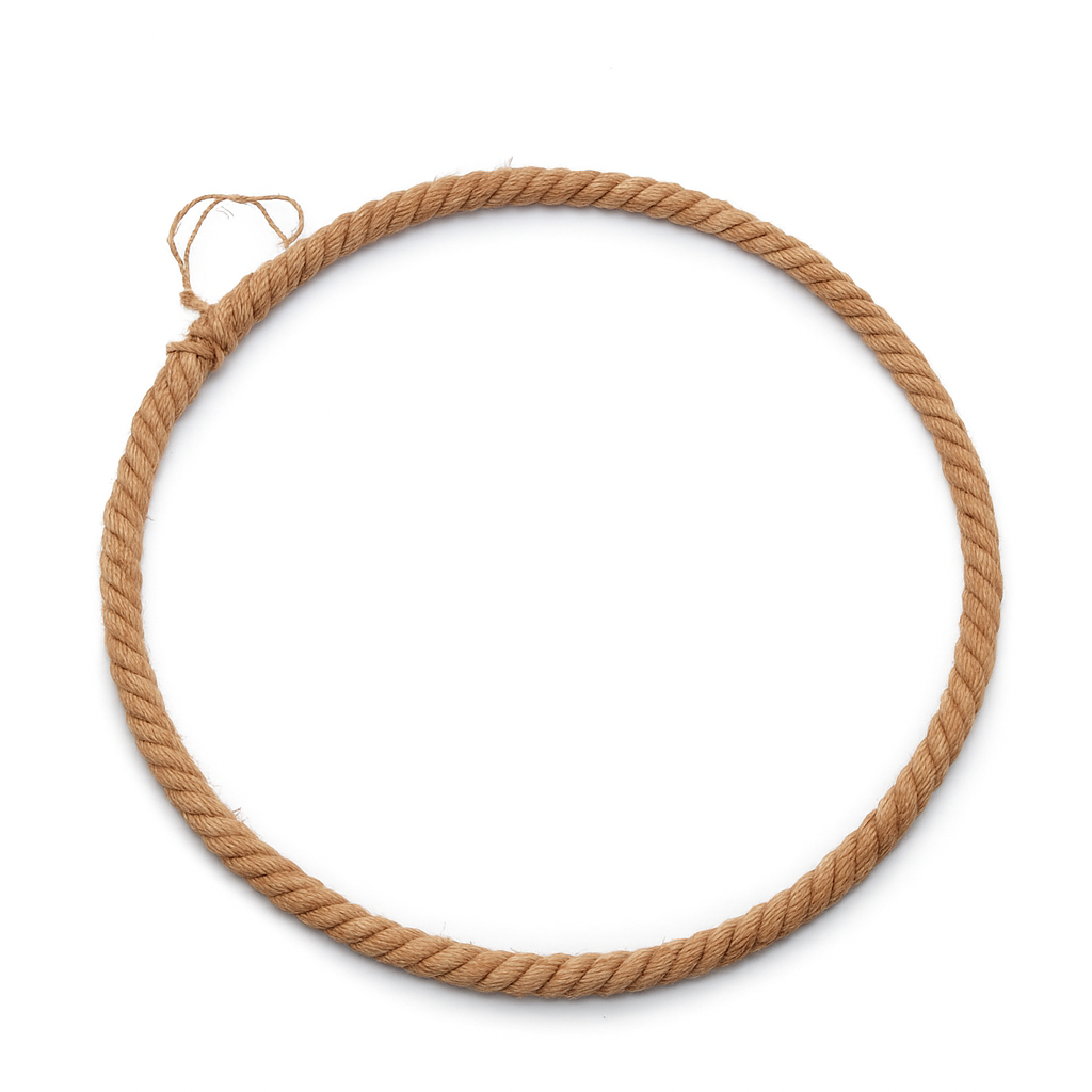 De ring is gemaakt van ijzer en met stevig touwmateriaal omwikkeld, waardoor hij een natuurlijke uitstraling heeft en goed zijn vorm behoudt. Combineer hem met lontwol, vilt, of andere natuurlijke materialen voor een uniek en ambachtelijk resultaat.