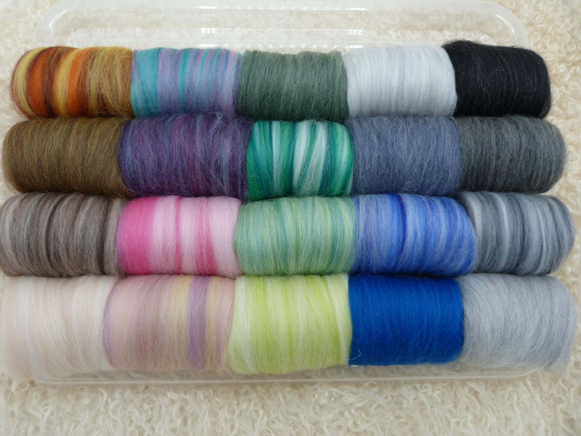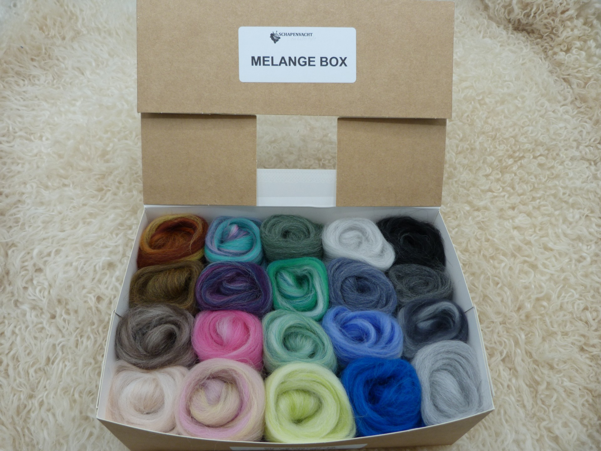 Inhoud van deze melange box is 20 rolletjes van ieder 10 gram Merino lontwol 27 micron bestaande uit.