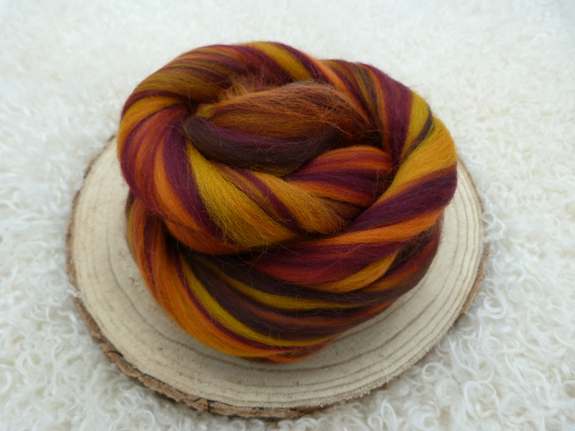 Deze corriedale lontwol welke door ons zelf is samengesteld bestaat uit de kleuren warm oranje, oker geel, bruin en bordeaux een mooie warme kleuren mix.De lontwol heeft een micron van ongeveer 27 en is afkomstig uit Nieuw-Zeeland en is zorgvuldig geselecteerd om een ​​constante kwaliteit te garanderen. De vezellengte is ongeveer 80 mm en voelt aangenaam aan. Deze lontwol is zeer geschikt om mee te natvilten, droogvilten, spinnen en te weven. Er zit ongeveer 4 meter lont in 100 gram.