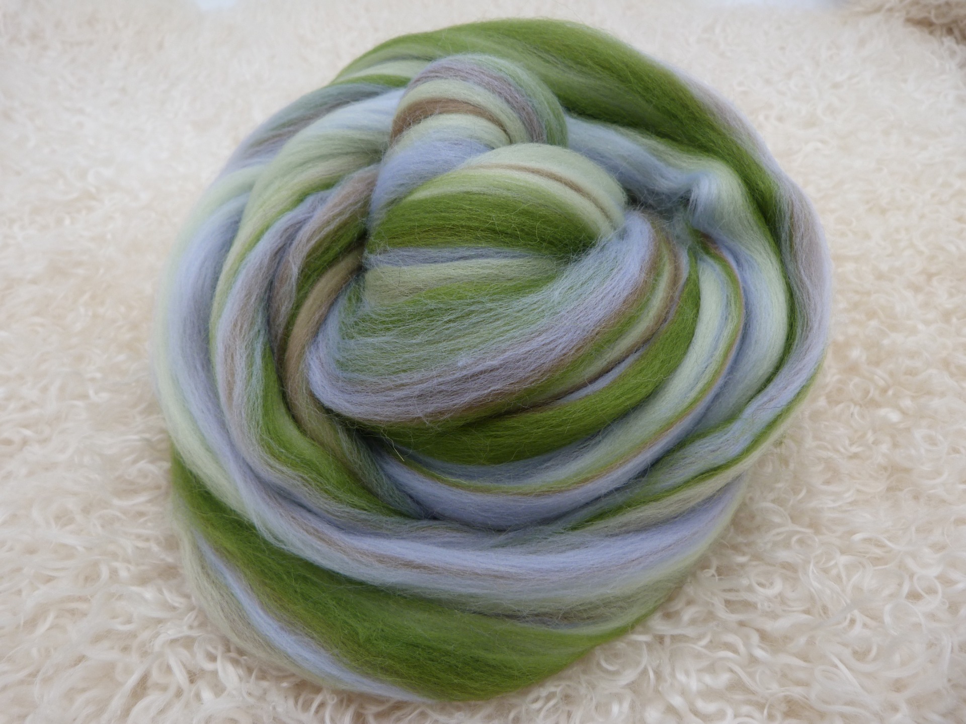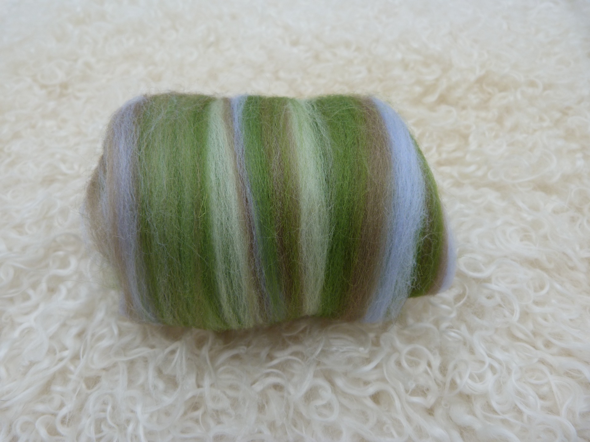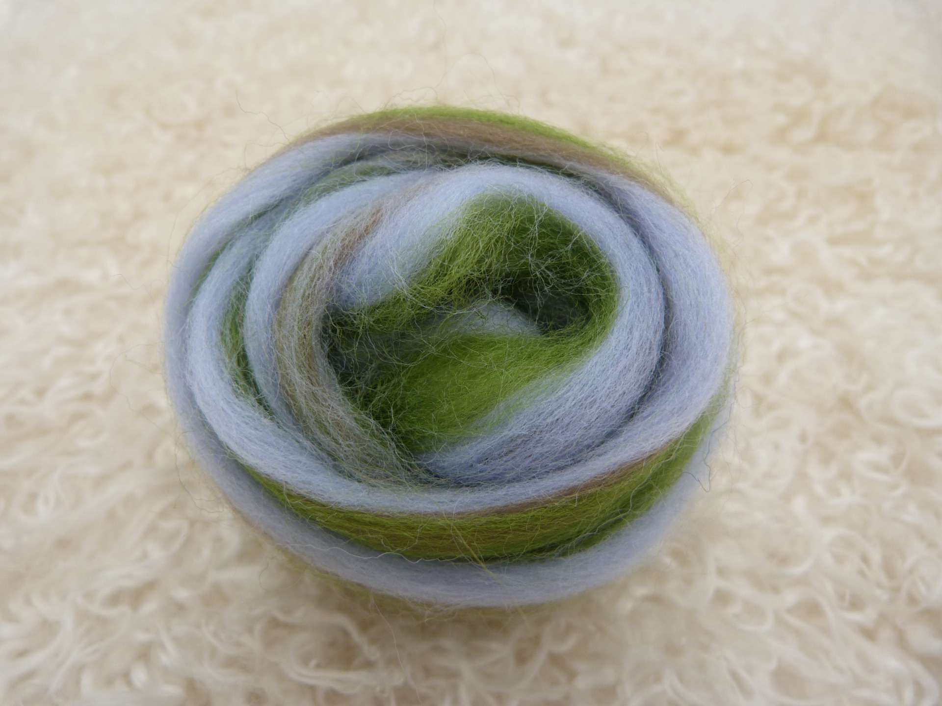 Deze corriedale lontwol welke door ons zelf is samengesteld bestaat uit de kleuren grasgroen, baby blauw, mint en camel een mooie frisse kleuren mix.De lontwol heeft een micron van ongeveer 27 en is afkomstig uit Nieuw-Zeeland en is zorgvuldig geselecteerd om een ​​constante kwaliteit te garanderen. De vezellengte is ongeveer 80 mm en voelt aangenaam aan. Deze lontwol is zeer geschikt om mee te natvilten, droogvilten, spinnen en te weven. Er zit ongeveer 4 meter lont in 100 gram.
