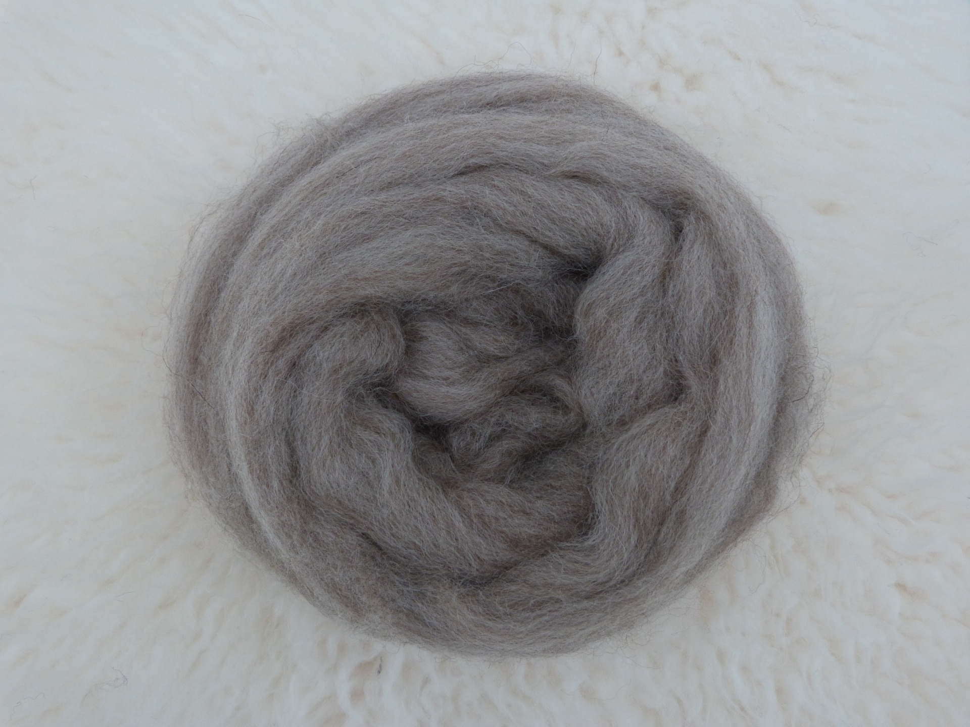 Deze (bruin/grijze) in lont getrokken Leicester wol is afkomstig uit Engeland en is heel goed geschikt om mee te spinnen, maar ook om mee te natvilten en naaldviten.
