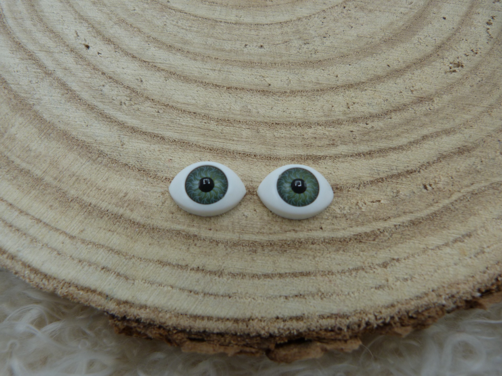Deze grijs-groene oogjes zullen met lijm worden bevestigd, de iris van de oogjes zijn 7 en 9 mm, de omvang van het oogje is voor de 7 mm 1,4 mm breed en voor de 9 mm 1,6 mm breed.