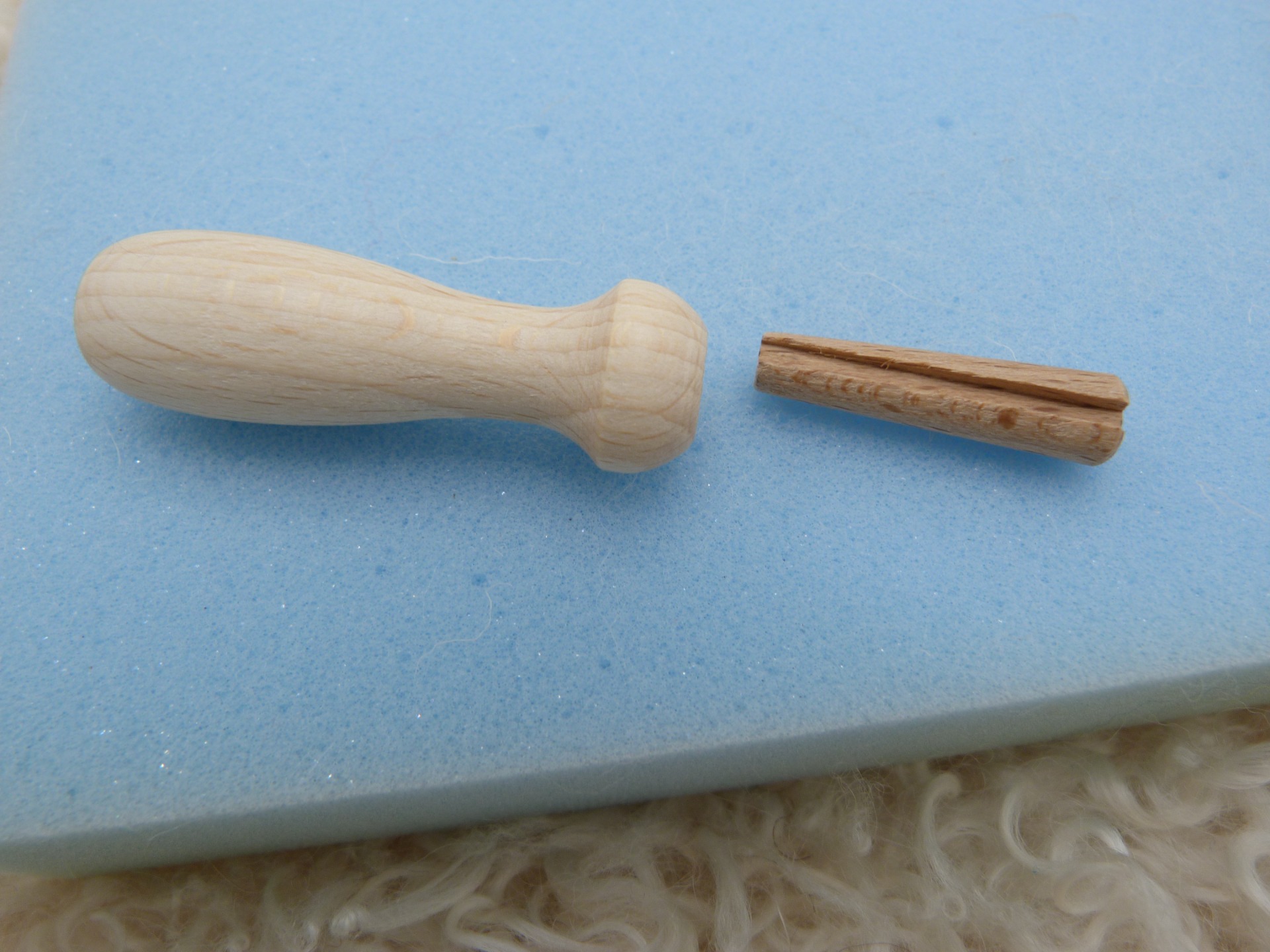 Let bij het inleggen van de naald dat de naald past in het gleufje van het ronde houtje, druk dan het ronde houtje( samen met de naald) stevig met de smalle kant in de houder. Net als een kurk in een fles.