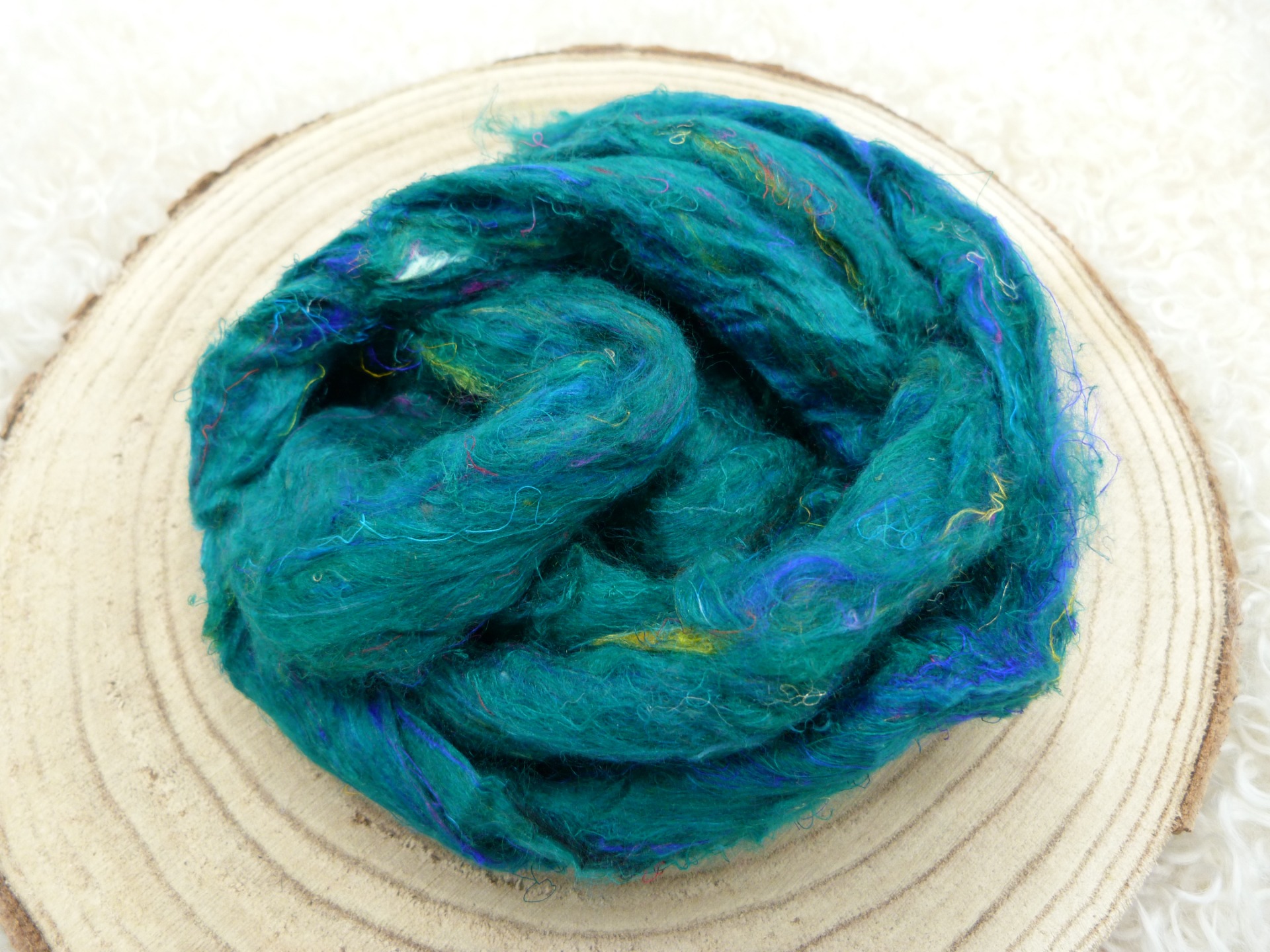 Deze sari zijde is afval welke afkomstig is van productielijnen waar ze onder andere sari's (jurken) maken, de zijde is in een lont getrokken. Deze Sari Silk is hand geverfd en is perfect om mee te spinnen maar ook als het gemengd is met wol kun je er ook mee naaldvilten en natvilten.